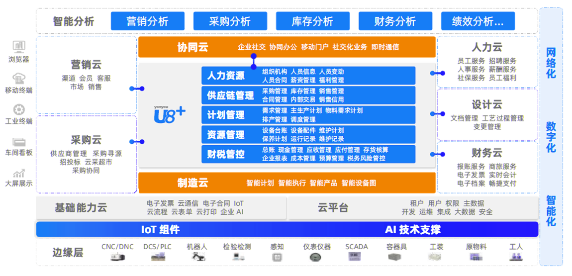 在企業(yè)上云的大趨勢下,U8+ 全面轉向互聯(lián)網方向,深入融合云應用,一站式提供財務、營銷、制造、采購、設計、協(xié)同、人力等領域的“端 + 云”服務,并通過軟硬一體化、產業(yè)鏈協(xié)同的策略全面賦能成長型企業(yè)在技術、供應鏈、生產、財稅、營銷等領域的創(chuàng)新升級。為成長型企業(yè)提供基于互聯(lián)網的業(yè)務協(xié)同、網絡交易、智慧運營的全新平臺。